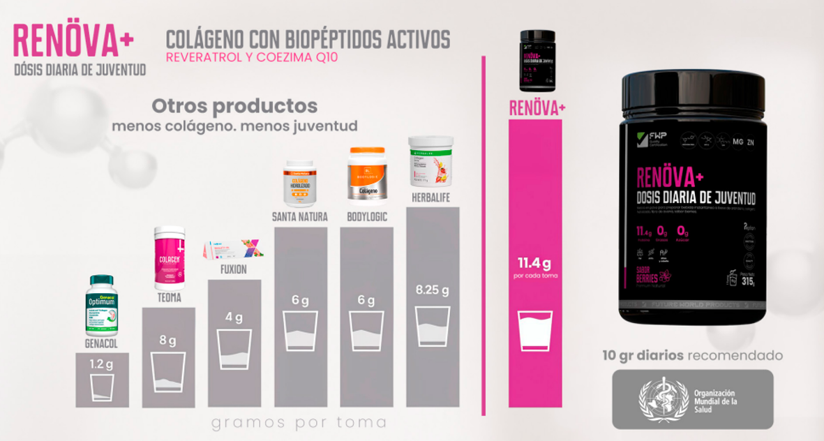 Te presentamos el TRIO PERFECTO: RENOVA +, que incluye 11.4 gramos de proteína de colágeno por toma diaria, 300 mg de resveratrol y 51 mg de Coenzima Q10. ¡Todo lo que necesitas para cuidar tu cuerpo y mantenerlo en su mejor estado!